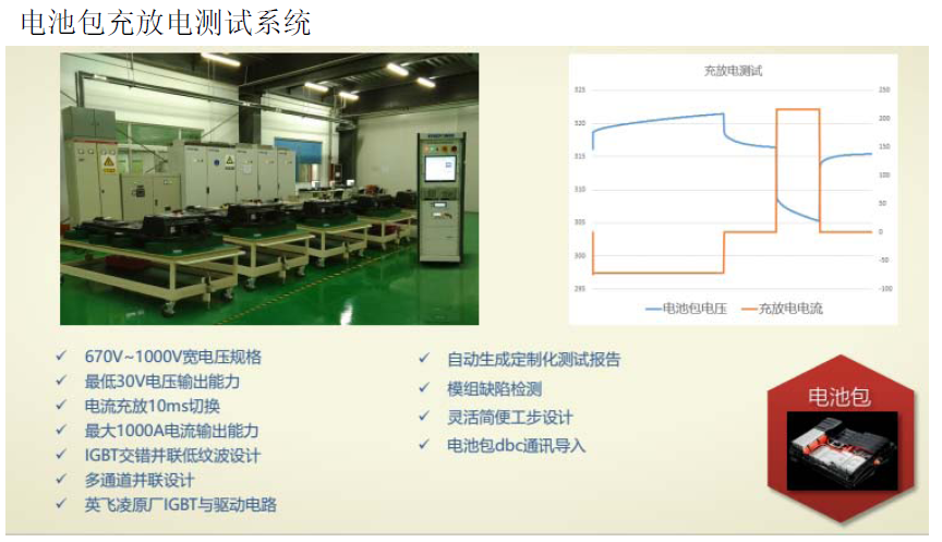 电池包测试能够模拟充电桩充电与整车实际运行充放电。测试设备可以模拟充电桩与电池总成间的控制信号交互与充电过程,来验证电池包与充电桩的配合。同时,测试设备还可以模拟整车运行过程中对电池包的充放电工况,完全模拟实际工况更能检验电池包的综合性能,从而提高整车联调的效率。